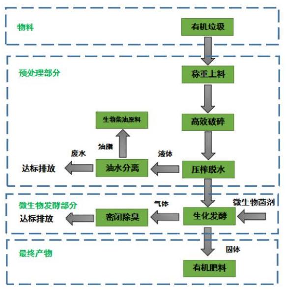 ?。?)餐廚垃圾經(jīng)破碎、壓榨預(yù)處理后的物料輸送入好氧發(fā)酵倉內(nèi),在適宜的倉內(nèi)環(huán)境中進(jìn)行24h好氧發(fā)酵;